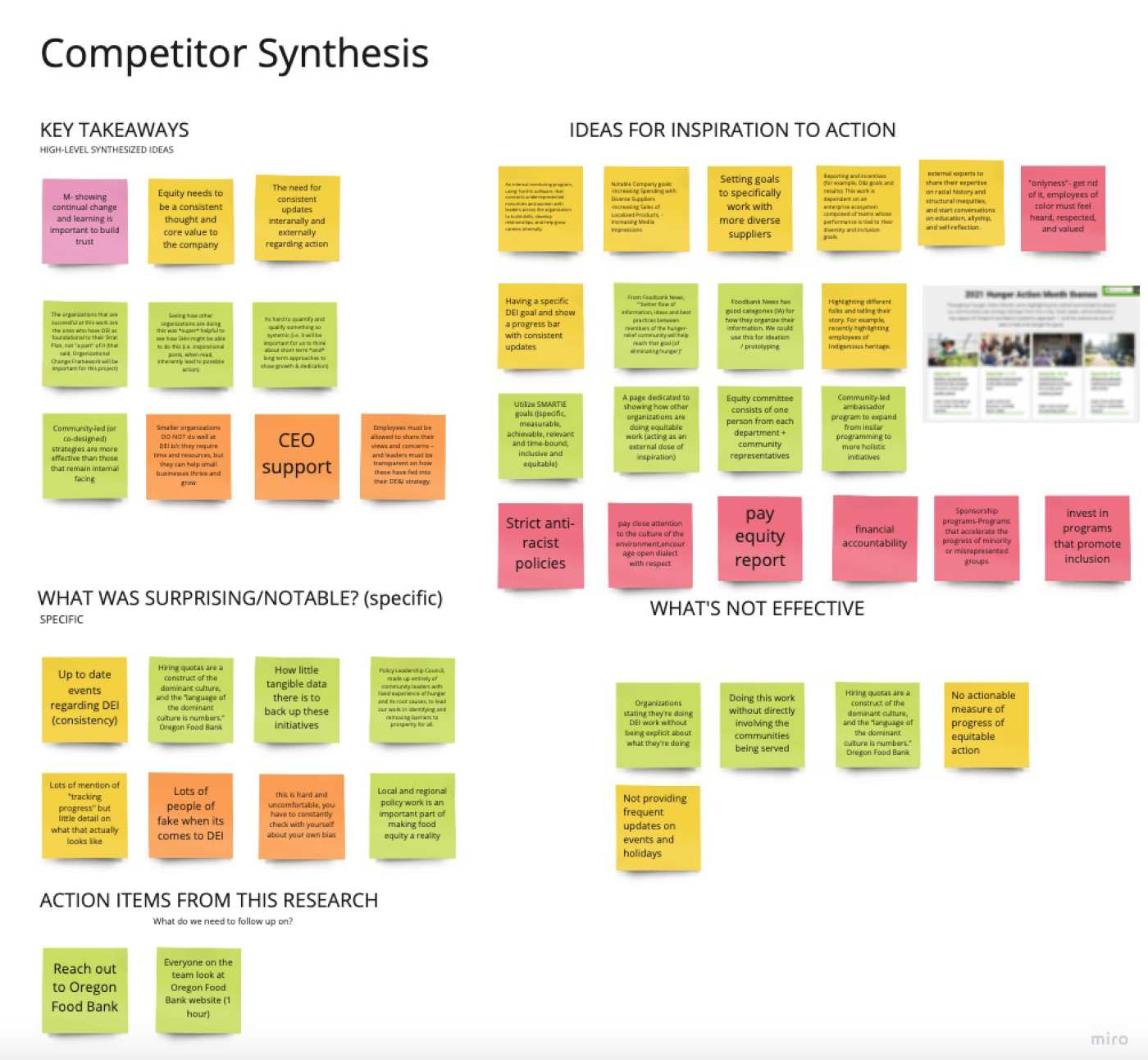 The competitor audit looked at large organizations and other non-profit food organizations to better understand how other organizations do DEI work. We compared the companies by: