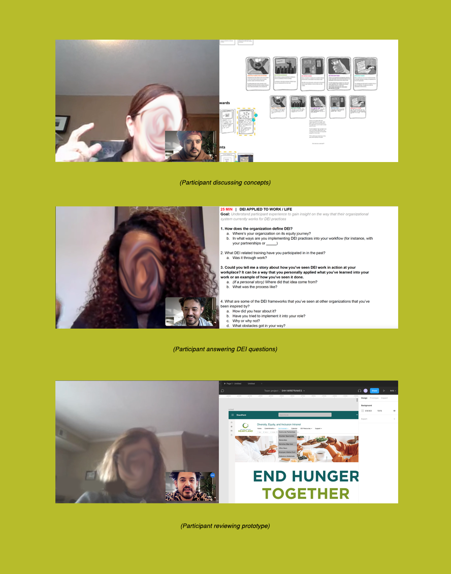 We got a list of people from Sook Jin to potentially interview. We sent out emails and scheduled interviews. These folks ranged in different positions across Second Harvest Heartland and their partners. Additionally, we as a group, each had connections with subject matter experts in other organizations. We wrote two scripts (one for internal employees and one for subject matter experts) to better gain an understanding of what employees perceived Second Harvest doing in regards to DEI or what they were doing in their own organizations, respectively.