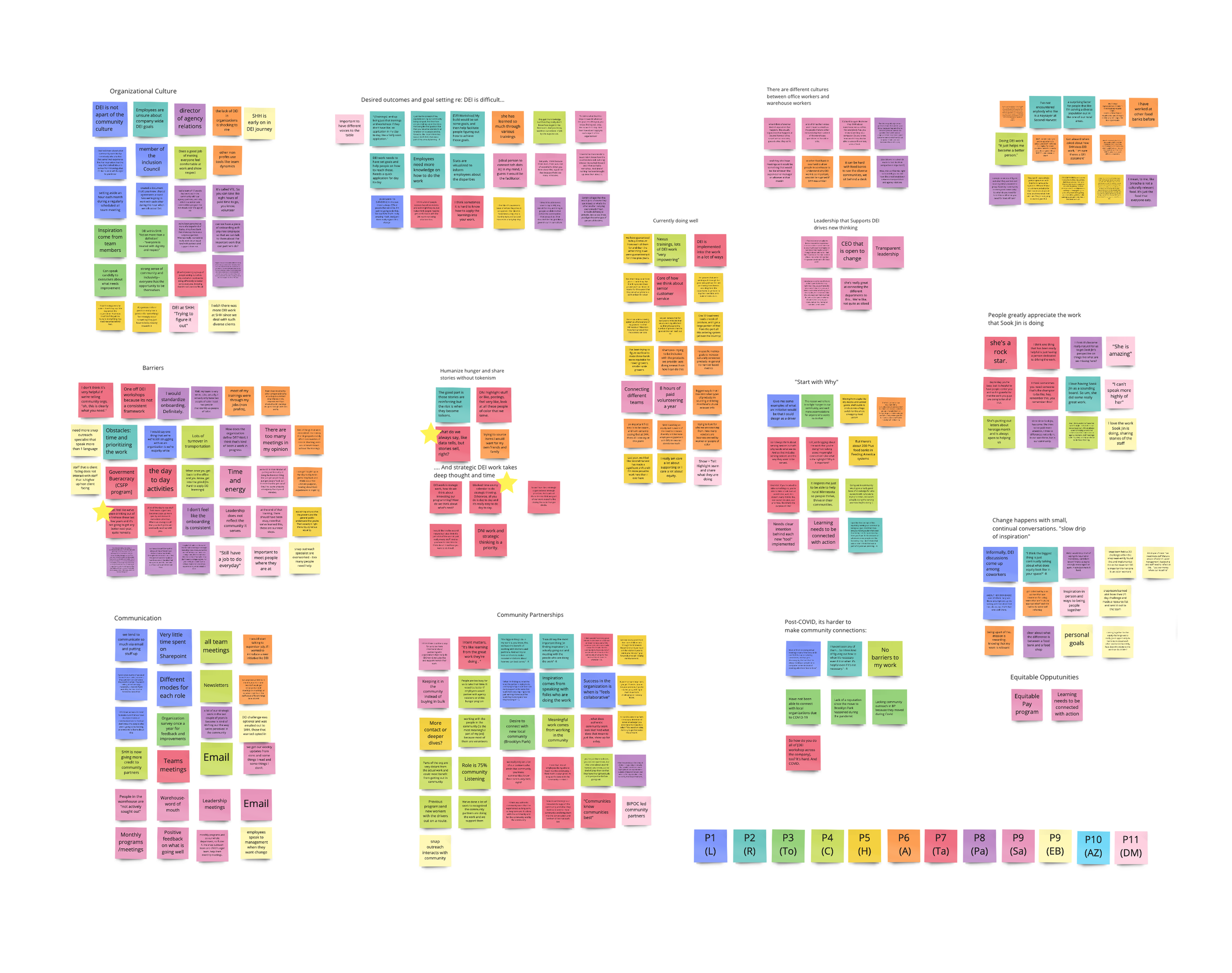 We took all of our notes from the interviews and synthesized them on a large digital whiteboard in a Miro board. Each post-it note represents a different research participant. From this research we were able to pull findings.